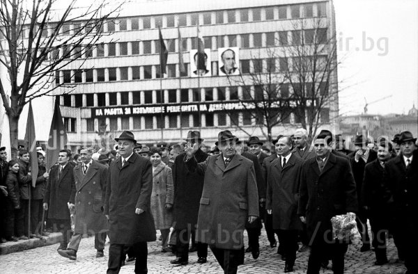 На трибуната с Тодор Живков е членът на ЦК на БКП Пенко Герганов и първият секретаря на БКП в града Иван Бешев, а зад гърба им е поставен огромен лозунг с надпис: "На упорита работа и борба за изпълнение решенията на декемврийския пленум на ЦК на БКП!".