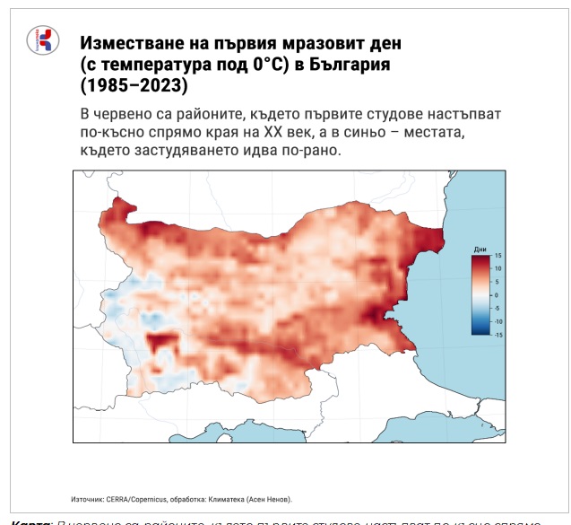 Данни от климатичните анализи показват ясно изместване на първите студове в България – в повечето райони на територията на страната температурите под нулата в наши дни настъпват с 5 до 15 дни по-късно спрямо края на XX век. На практика това означава, че зимата като сезон у нас е по-къса, а лятото и есента се удължават.