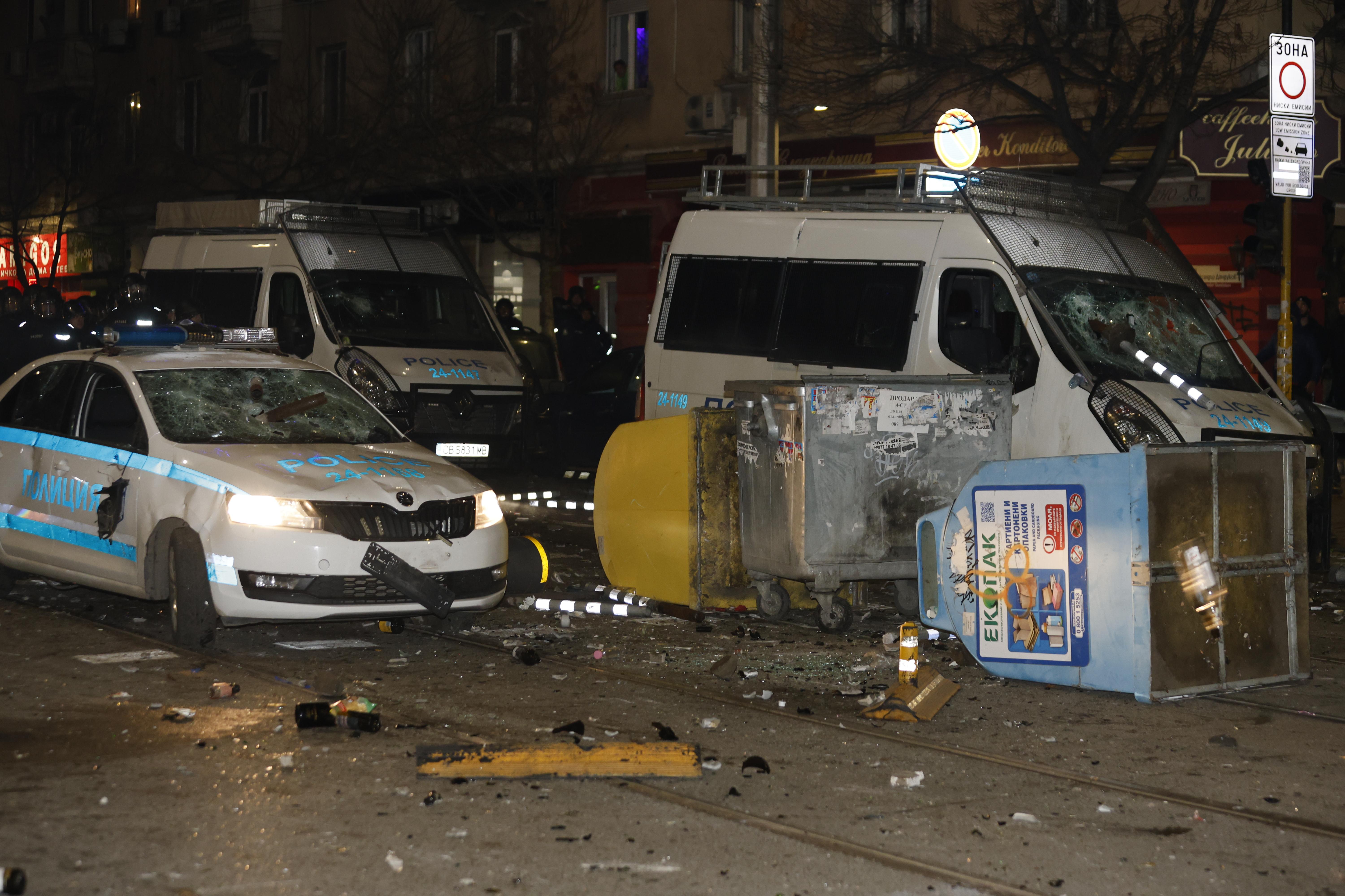 Обръщат се контейнери за боклук, има подпалени контейнери. Виждат се счупени стъкла на полицейски коли. Протестиращите тръгнаха срещу униформените и с част от коледната украса в района. Един от тях развяваше знаме на Българския футболен cъюз.